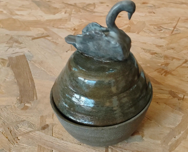 La figure du cygne, sobrement campée, semble flotter dans une immobilité méditative. Elle confère au contenant une aura de calme et de contemplation. L’œuvre invite à un dialogue silencieux entre nature, matière et intériorité.